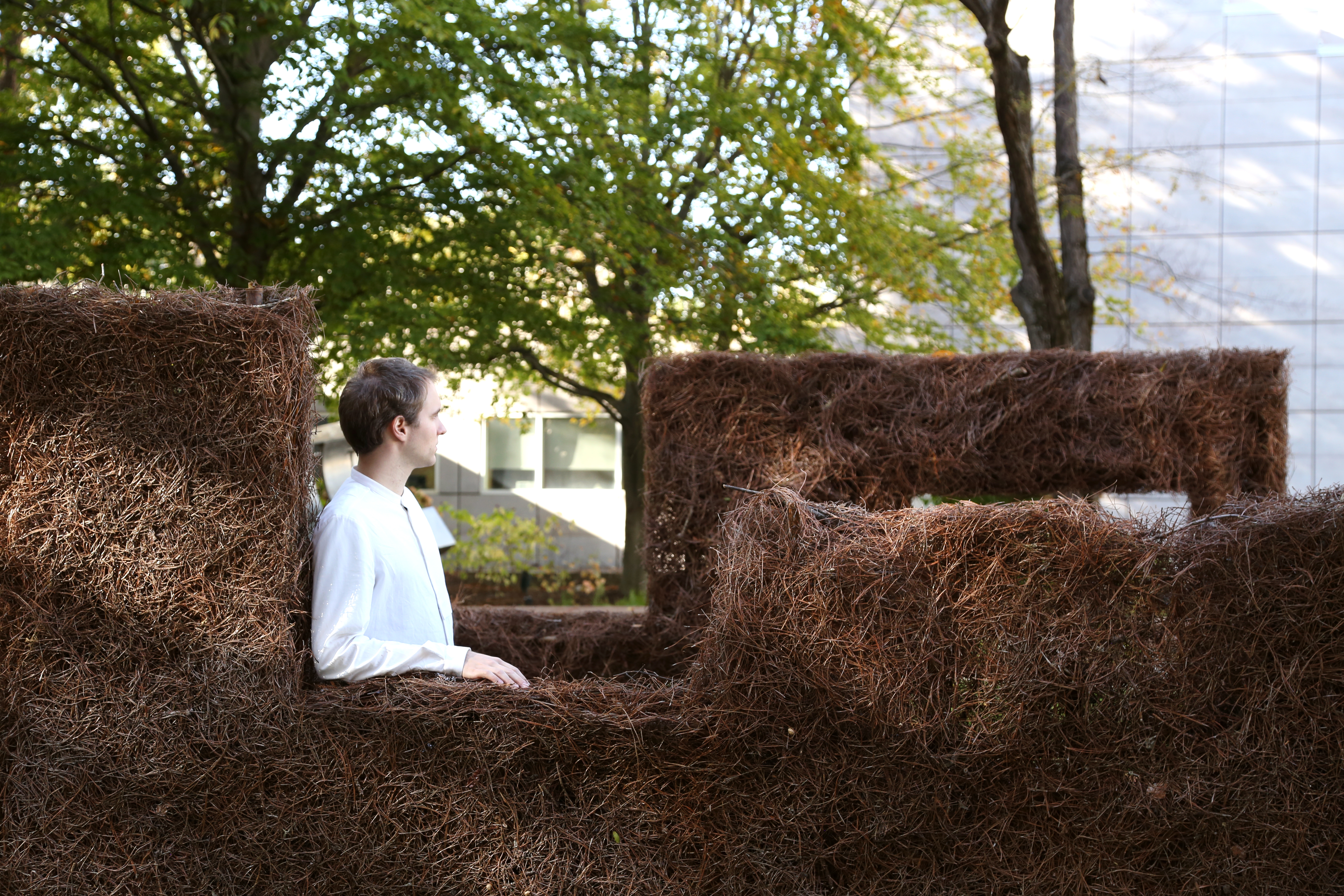 Parklet Chair is an island landscape, displaced from soil, water, and sun and resituated in the interior. It is real, in that it is grown, but perhaps unnatural, in that it sprouted indoors without soil. Germinated from seeds and preserved with a bio-based binder, it is a seat that can transport its occupant beyond the envelope of building systems and into the landscape, into warmer seasons when grass was still vibrant green.