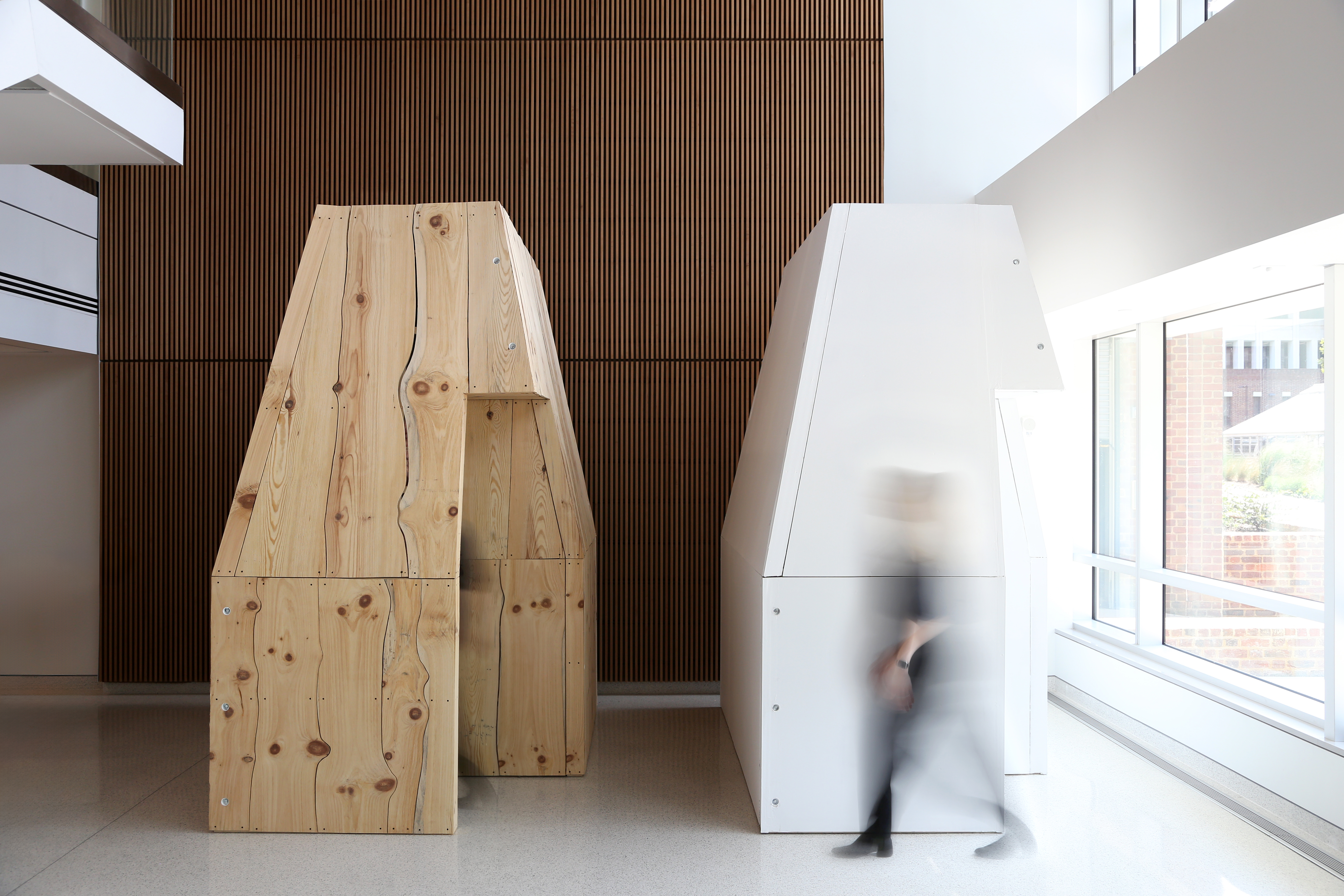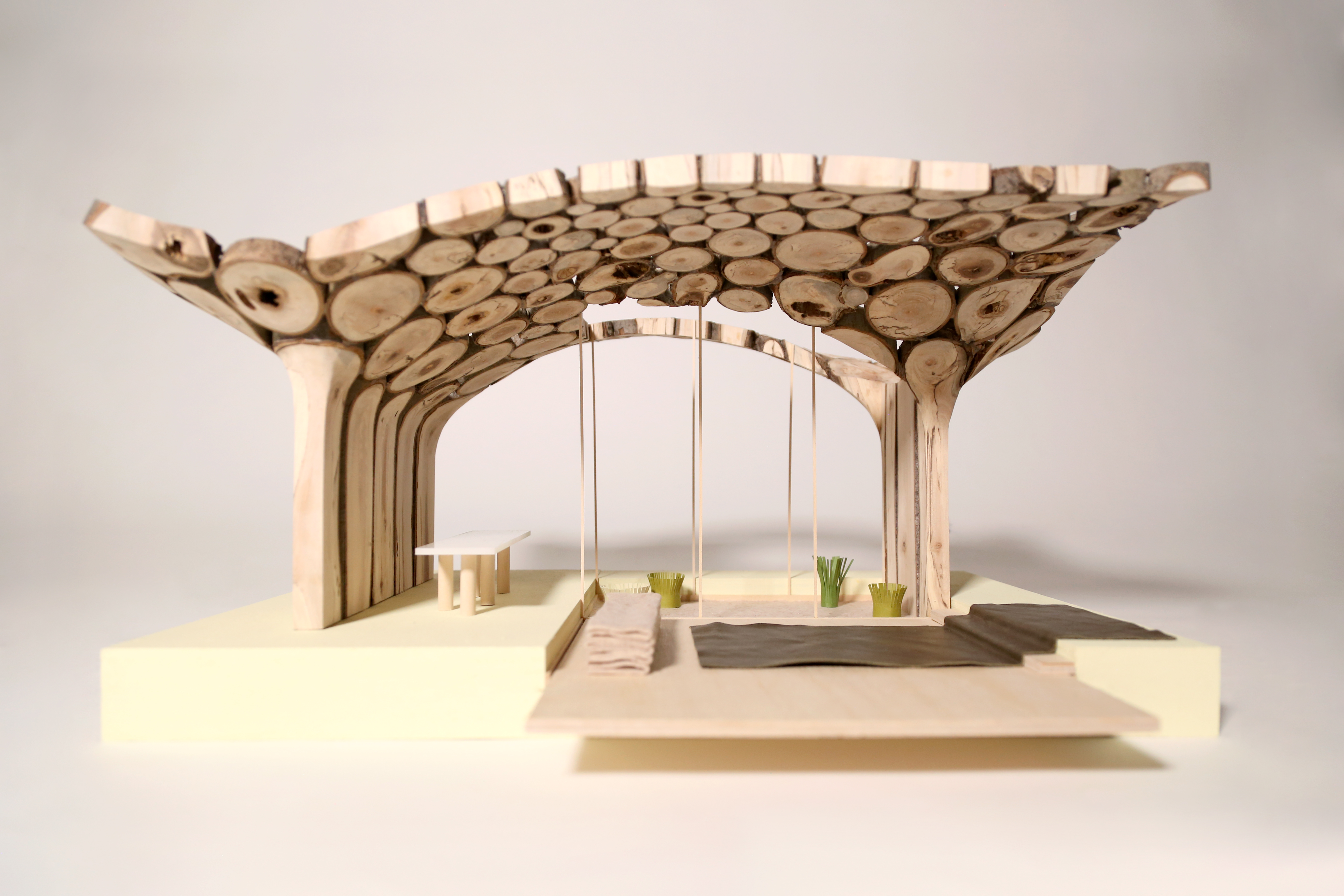 Non-linear wood unfit for traditional lumber is used to construct curving panels. Boards cut on a purpose-built robotic sawmill are stacked into snaking walls, making use of natural curvature to create thin structural surfaces. Straight boards are salvaged from a demolished building, refinished, and assembled into straight panels linked the curved segments. The curved and straight panels are all post-tensioned with threaded rod, avoiding the need for adhesives during assembly and allowing for easy decommissioning into boards.