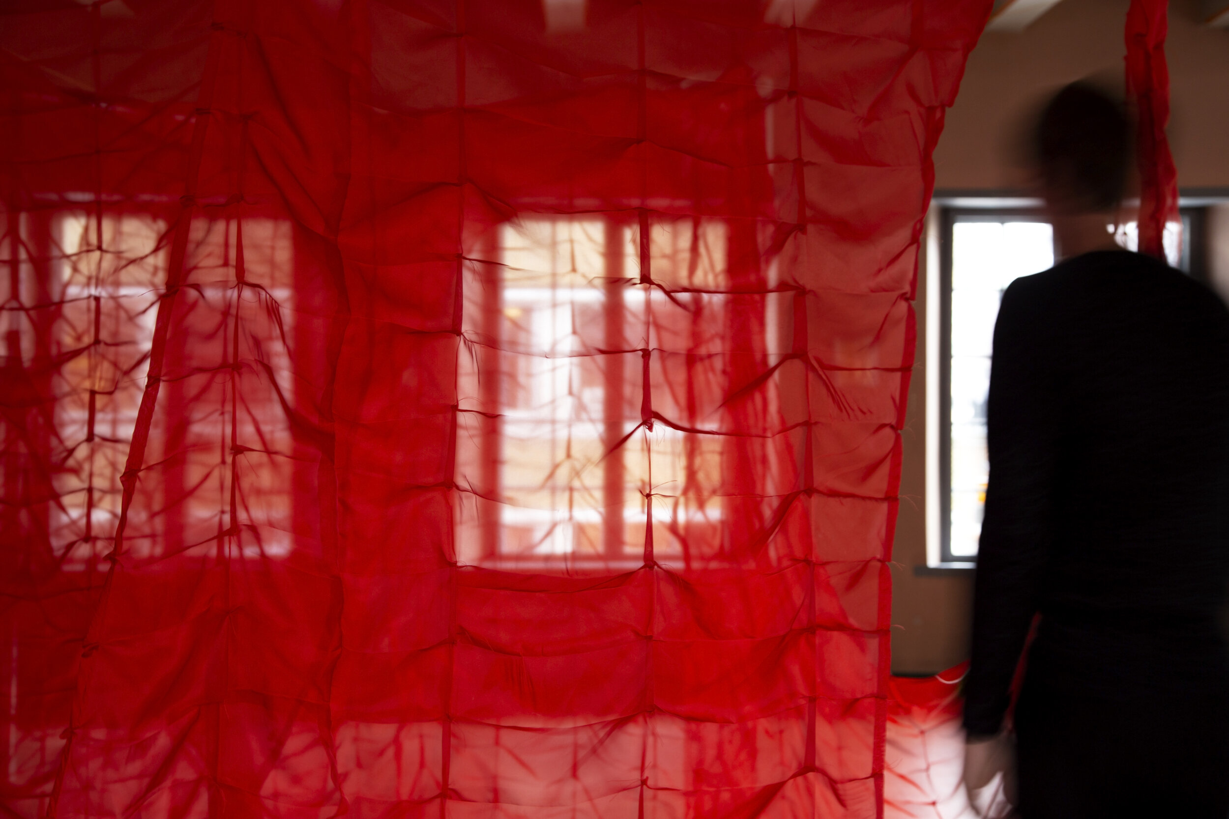 The wall is made of translucent red fabric, thermoset with a geometry of bricks and cut and draped to form a series of arches. The imprint of bricks gives structure to the fabric, while also transforming the masonry technique from one of mass and permanence to one of collapsible temporality.