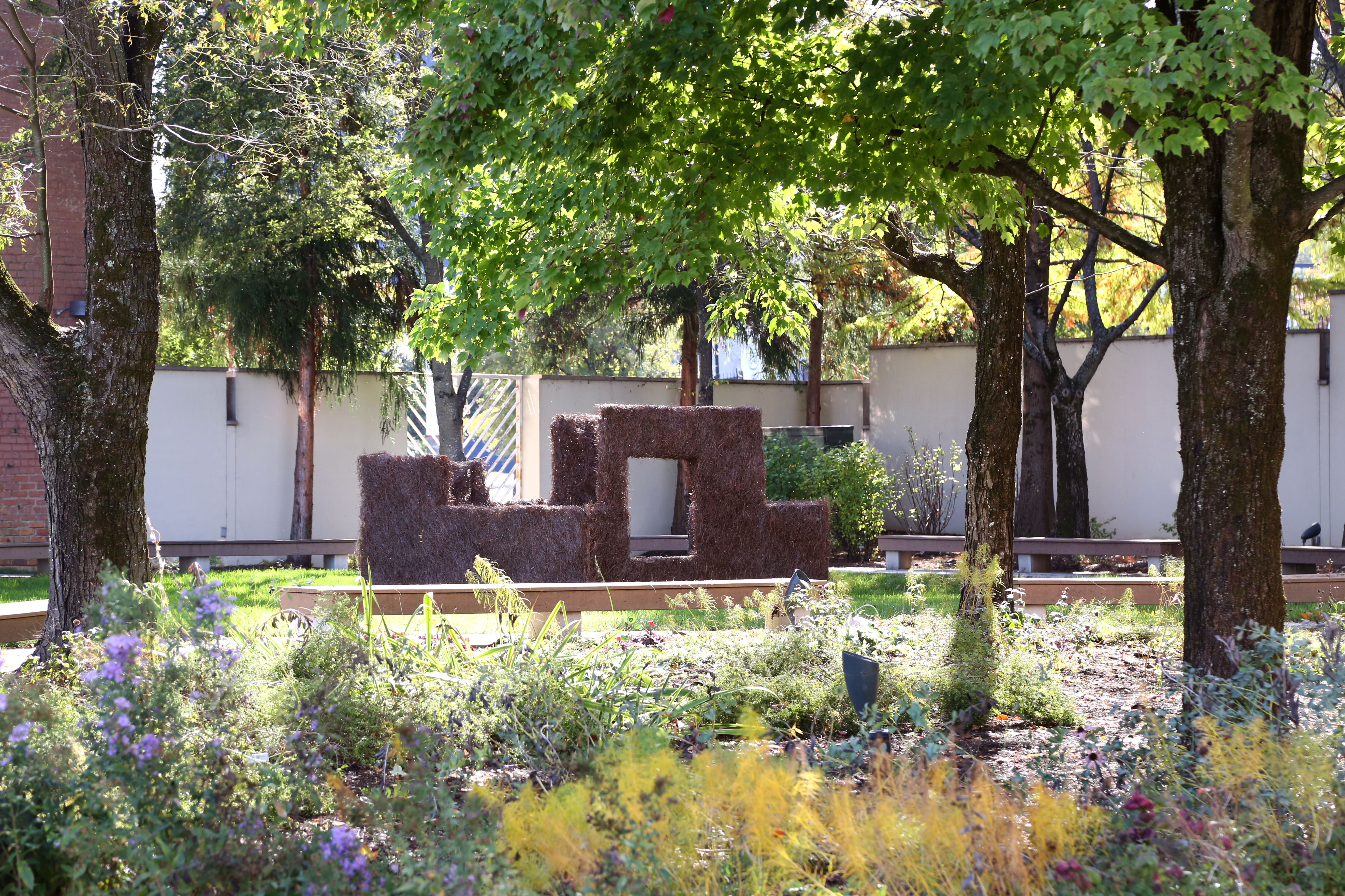 Wood, bricks, and scraps form a 15’ long dining table that creates a center for the installation. Bound with bioresin, this table closely resembles congealed scrapple. A game of “I spy” uncovers panels salvaged from Eliel Saarinen’s church tower and branches from Mill Race Park.